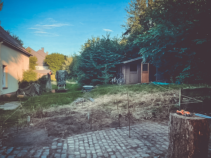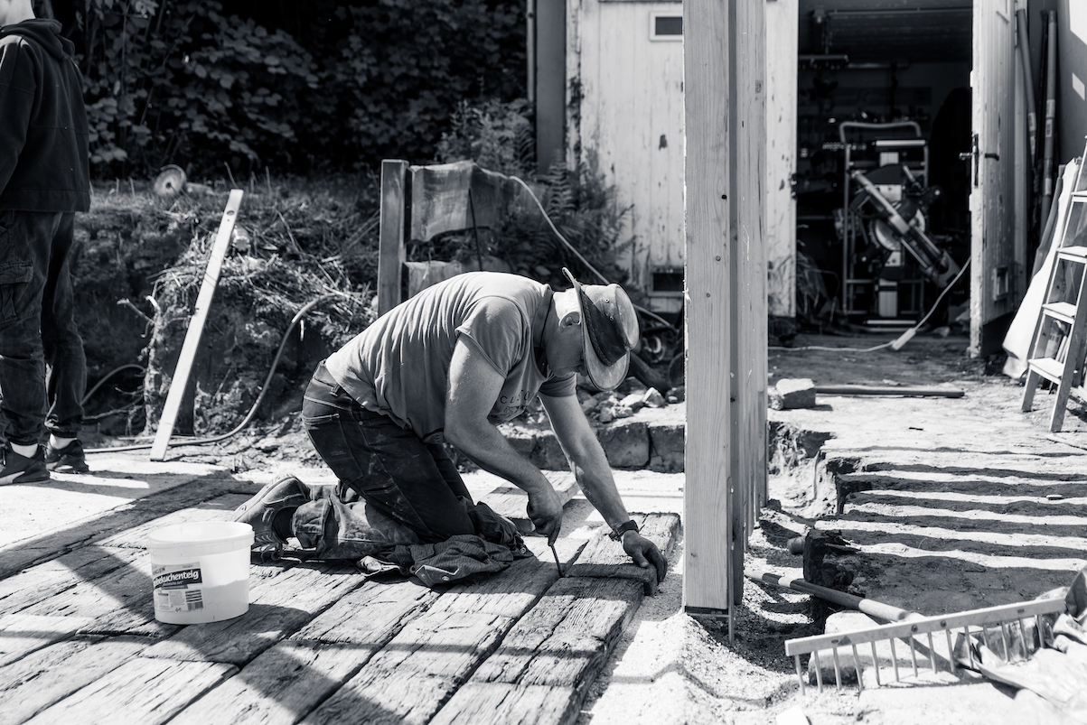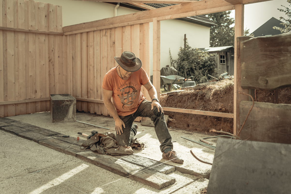Nachdem die Wände teilweise gesetzt wurden, war der Boden dran. Er wurde mit Betonplatten mit Holzmuster gepflastert