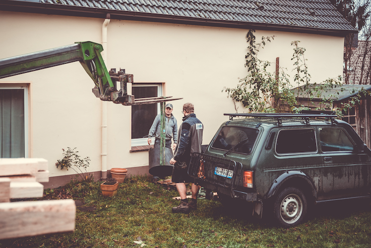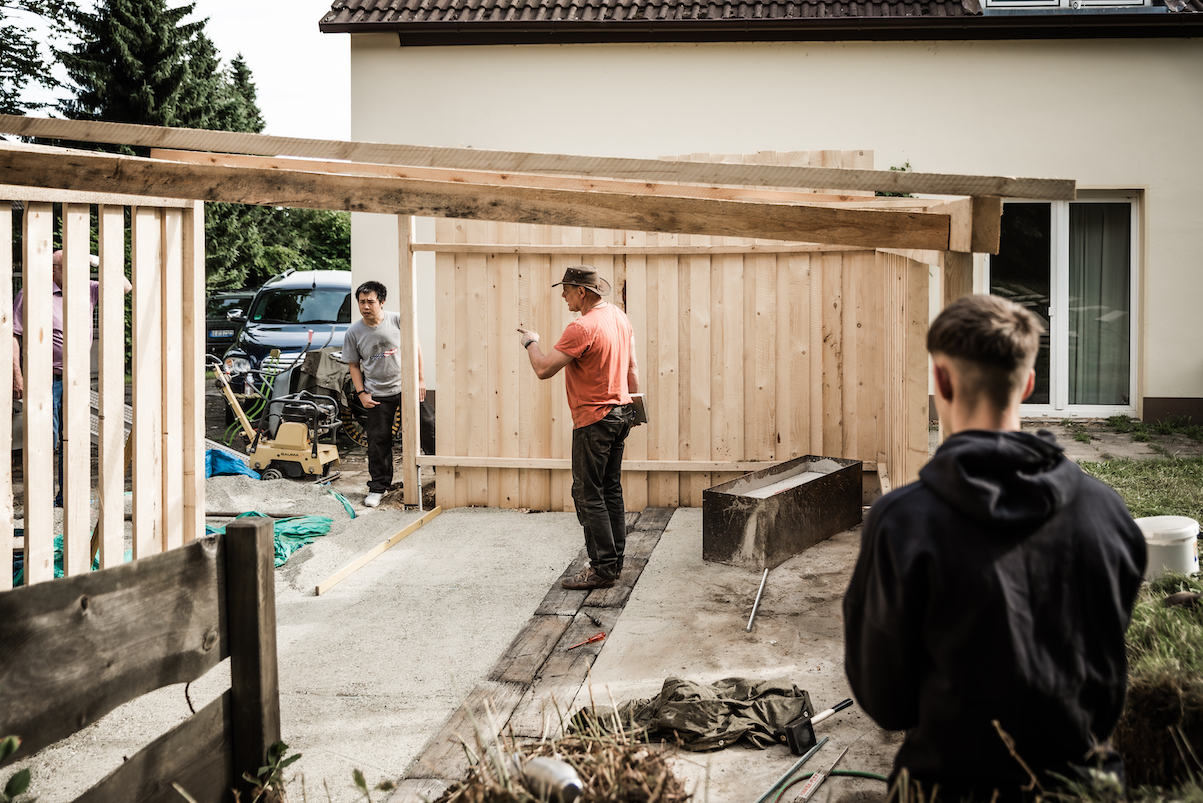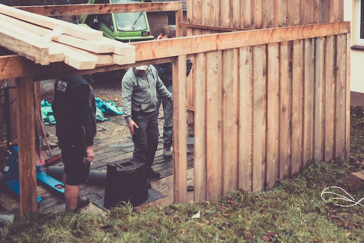 Dan zahlreicher helfender Hände geht der Bau sehr zügig voran. Der Betonboden wurde gegossen und das Grundgerüst aus Holz aufgebaut